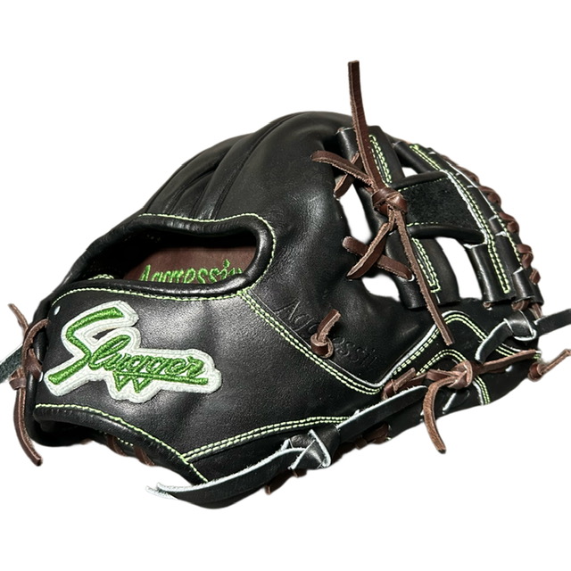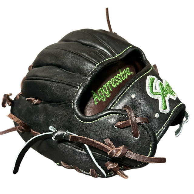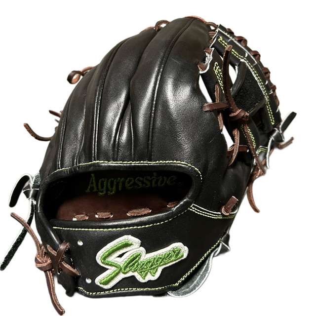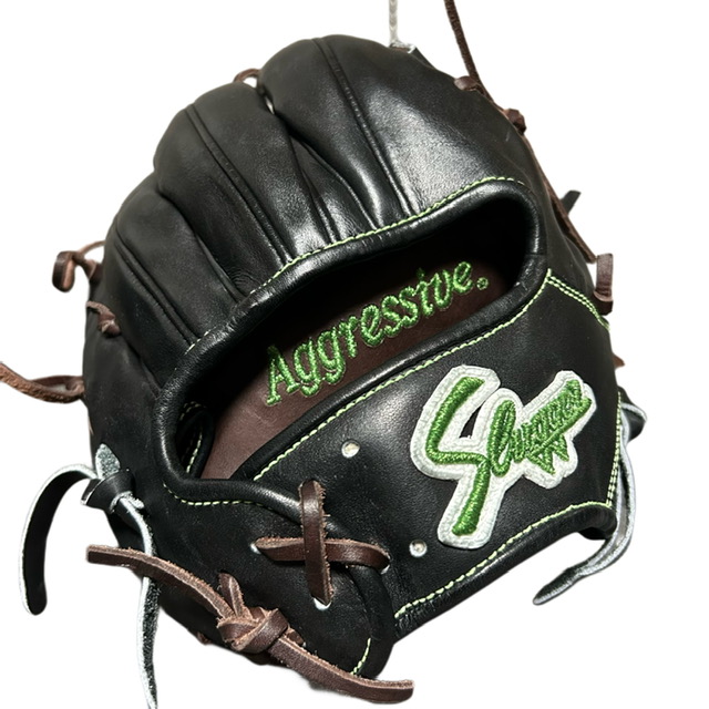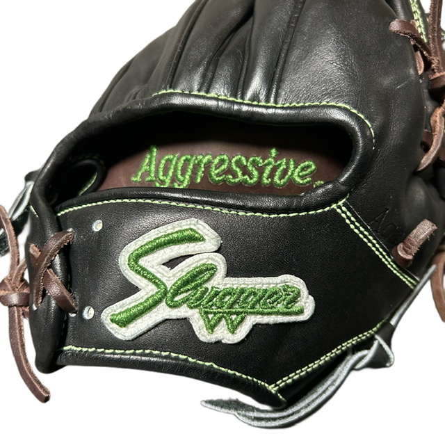 宇治抹茶のような渋いカラーリング。 一目惚れ。 平裏部にはグリーンラメでAggressiveの刺繍。 手入れ部をやや小さくし親指部にサムホールド機能を付けたモデルです。 高校生のサード用、もしくは中学生のオールラウンド用にピッタリの大きさです。 親指部はサムホールドという補強革がラベル部まで伸びており、非常にかっこいいです。また捕球面の折り返しが無いUカットモデルなのでウェブ下が浅めに設定されておりボールへのフィット感が高いです。 _________________________________________________________