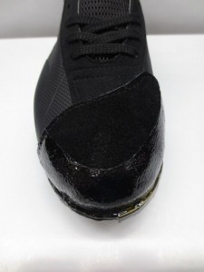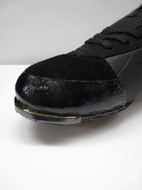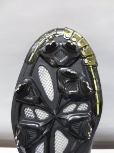 革製Pカバーを使用しアッパー部分を特殊ミシンで縫い合わせることでスパイクとP革が一体となります。