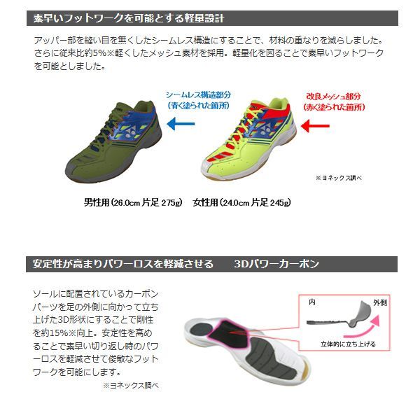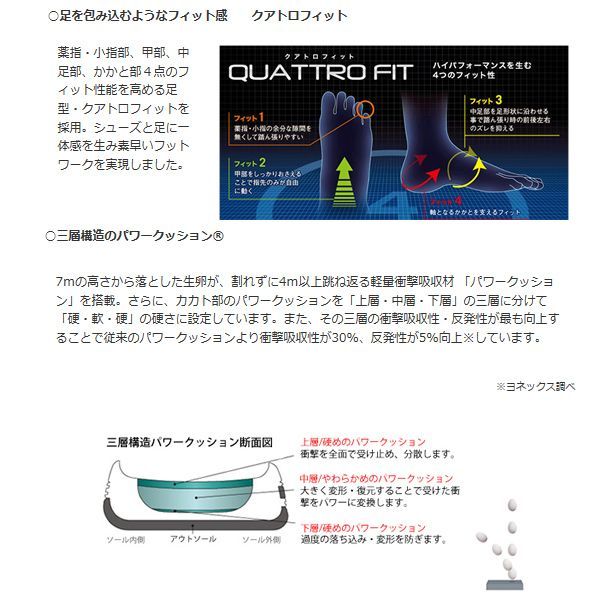 テクノロジー ・アッパー(甲)部を縫い目の無いシームレス構造としました。 ・材料の重なりを減らすと同時に、新たなメッシュ素材を採用することで全体的な軽量化を図りました。 ・ソールの中足部にあるカーボンパーツを立体的な形状とすることで、剛性を向上させ安定性を高めました。 ・7mの高さから生卵を落としても割れずに約4m跳ね返す衝撃吸収力・反発力を併せ持つ素材「パワークッション」をソール部分に搭載しています。