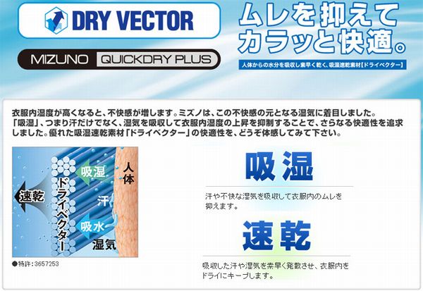 MIZUNO QUICKDRY PLUS 吸汗速乾性が優れていることを示し、汗を素早く 吸収、拡散、ウエア内を快適な状態に保ちます。
