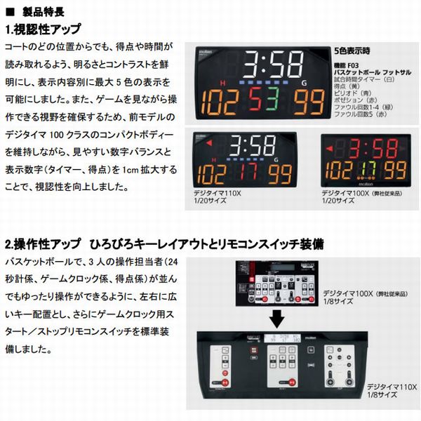 備考 ・数字高さ:試合時間タイマー14cm、得点13cm、24秒計12cm ・UX0110本体1台、リモコンスイッチ(1m)1個、PW05C3電源コード(5m)1本 ・お手持ちのデジタイマXシリーズと連動できます。 ・旧機種(UX0100)との主な違いは、操作性アップ(ひろびろキーレイアウトとリモコンスイッチ装備)と視認性アップ(最大5色の鮮明表示と数字サイズ拡大) ・幅71.5×高さ38×奥行24cm、5kg ・バスケットボール新ルール対応