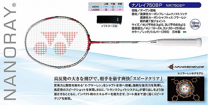 高弾性カーボンフレーム+ナノメトリック 高弾性カーボンシャフト+X-フラーレン 新内蔵T型ジョイント 10mm LONG 推奨テンション:20〜25ポンド 日本製 フレームのみ(ガットは張ってありません) ソフトケース付 日本バドミントン協会検定合格品
