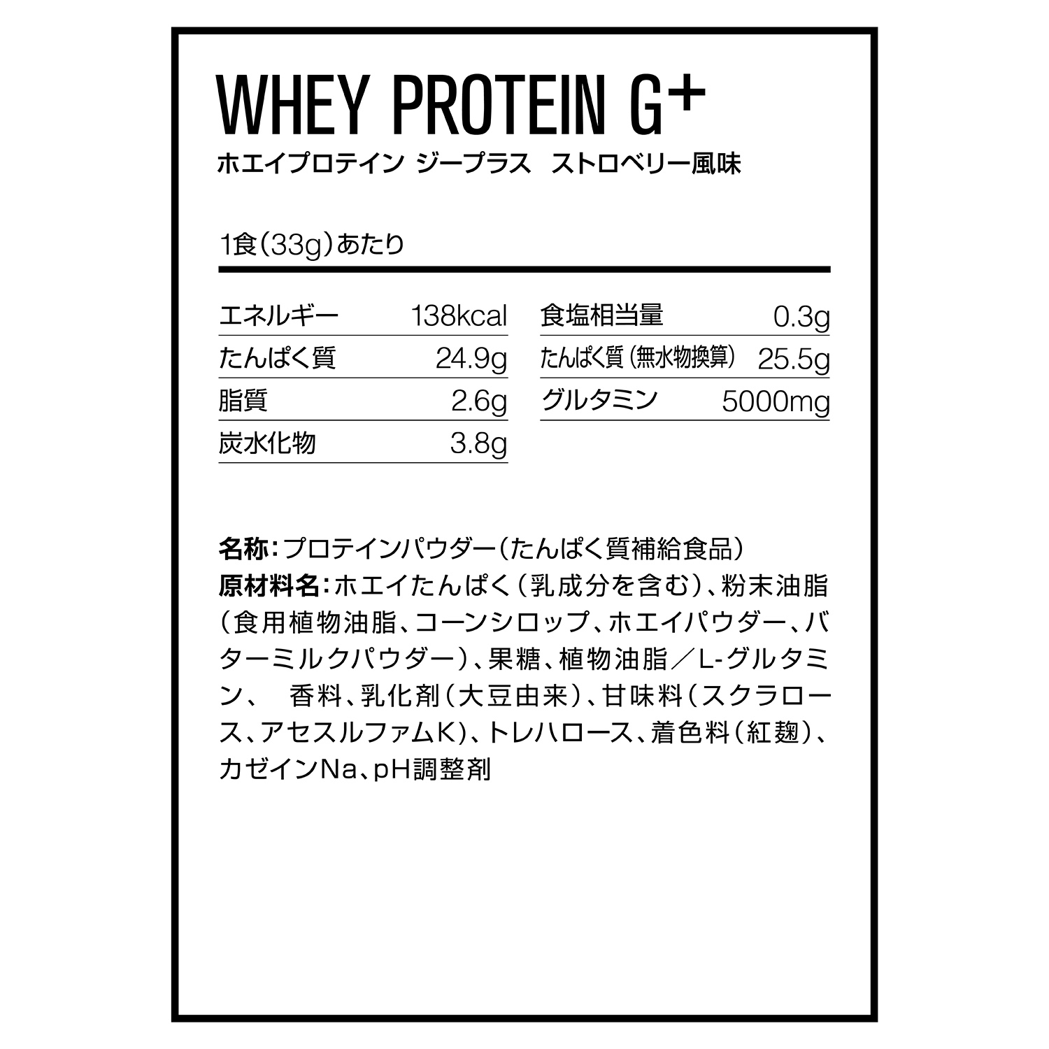 【素材】 ■原材料 ホエイたんぱく(乳成分を含む)、粉末油脂(食用植物油脂、コーンシロップ、ホエイパウダー、バターミルクパウダー)、果糖、植物油脂/L-グルタミン、 香料、乳化剤(大豆由来)、甘味料(スクラロース、アセスルファムK)、トレハロース、着色料(紅麹)、カゼインNa、pH調整剤 ※遺伝子組み換え作物(GMO)を使用していません。 【1食(35g)あたり】エネルギー:138kcal、たんぱく質:24.9g、脂質:2.6g、炭水化物:3.8g、食塩相当量:0.3g、グルタミン:5,000mg