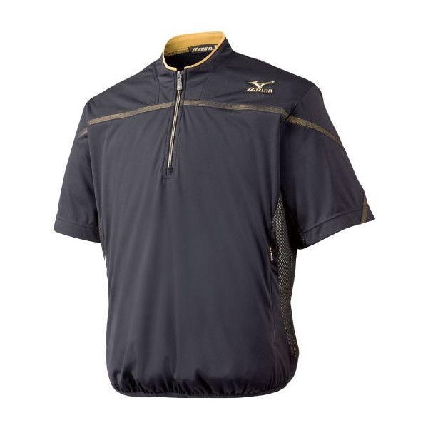 素材:ポリエステル100% 仕様:バックプリントあり(ミズノプロロゴ転写マークゴールド)、両脇ポケットあり(ファスナー付き)、ハーフZIP仕様 原産国:中国製