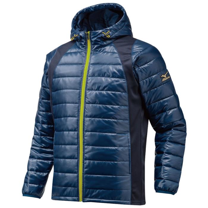 ミズノ MIZUNO 限定 グローバルエリート ムーブパーカーフルZIPジャケット 品番:12JE5K8709 カラー:14:ネイビー/ライムグリーン サイズ:S、M、L、O、XO 表地:ポリエステル100% 切替部:ポリエステル96%/ポリウレタン4% 裏地:ポリエステル100% 中綿:ポリエステル100% 生産国:中国製