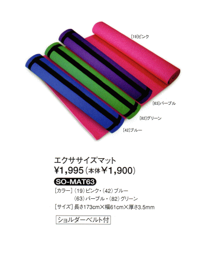 品番:SO-MAT63 カラー:19:ピンク/42:ブルー/63:パープル/82:グリーン サイズ:長さ173cm×幅61cm×厚さ3.5mm 素材:PVC(塩化ビニール)