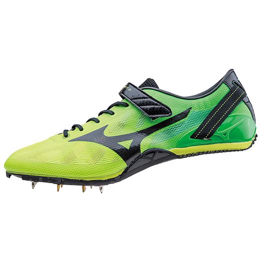 品番:U1GA1510 カラー:09:ライム×グリーン×ブラック サイズ:22.0〜29.0cm 質量:170g(26.0cm片方) 甲材:合成繊維、人工皮革 底材:合成底 スパイクピン:8ZA-303(8mm)、固定式(7mm) 競技種目:100〜400m、ハードル 競技場:オールウェザートラック専用 仕様:GEO PLATE Type-SH(SPRINT HALF Type)、セミラウンドソール、スプリントラスト、メッシュシャークソール 付属品:シューズ袋(中国製)付 原産国:中国製