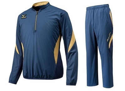 品番:ジャケット:12JE6J82/パンツ:12JF6J82 カラー:14/14:ディープネイビー×ゴールド サイズ:S、M、L、O、XO、2XO 素材:ポリエステル100% ニット部:ポリエステル91%、ポリウレタン9% 詳細:右肩と右ももにミズノランバードマークワッペン付き、後身頃上部とズボン左脇にミズノプロプリント 生産国:中国製
