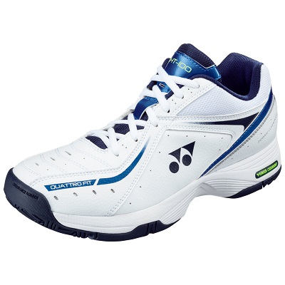 品番:SHT100 カラー:524:ブルー×ネイビー サイズ:22.0〜28.0cm アッパー:人工皮革 ミッドソール:合成樹脂 アウトソール:ゴム底 詳細:ローカット、3E設計 対象コート:オムニ、クレーコート用 原産国:ベトナム製