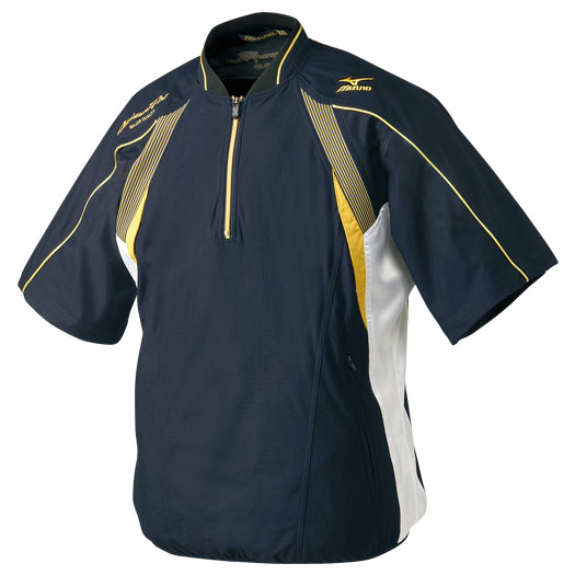 半袖ハーフジップトレーニングジャケット。背中、右肩にミズノプロロゴ刺繍入り。