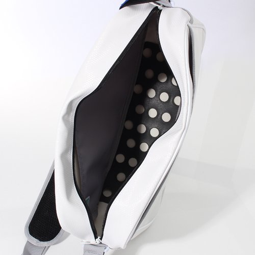品番:KBQ64 カラー:AB0953:ホワイト×シルバーメット サイズ:W41cm×H28cm×D14m 容量:16L 素材:PUレザー、合成皮革(ポリウレタン樹脂) 原産国:中国製