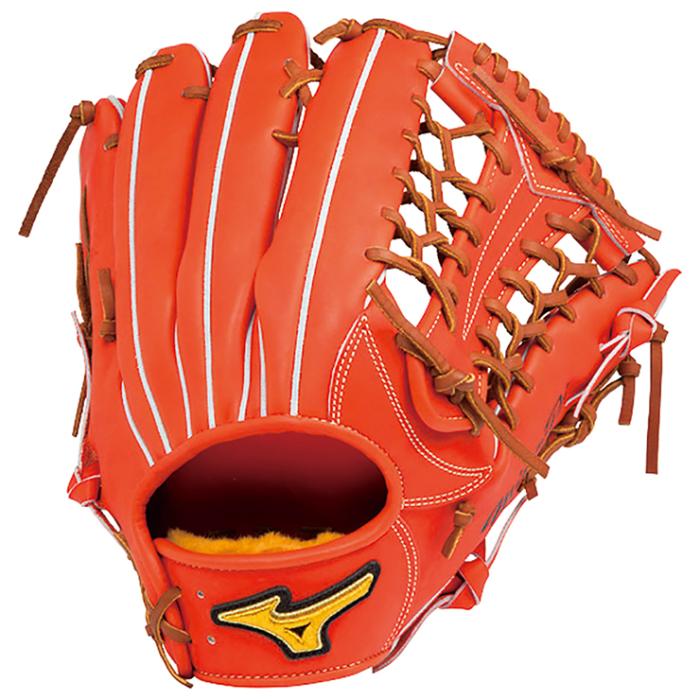 品番:1AJGH14017 カラー:52X:スプレンディッドオレンジ(縫糸:シャンパンゴールド) 素材:ジェネラルキップレザー(天然皮革:牛革) サイズ:15 ポジション:外野手用(右投げ用) 付属品:BSSショップ限定専用袋付き 原産国:中国製