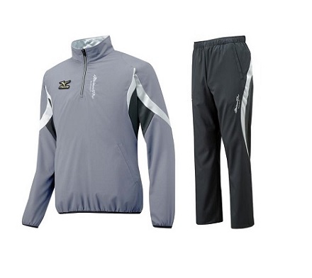 品番:ジャケット:12JE6J80/パンツ:12JF6J80 カラー:07/09:キャスチャコール×ブラック サイズ:S、M、L、O、XO、2XO 素材:ポリエステル100% メッシュ部:ポリエステル91%、ポリウレタン9% 詳細:右肩と右ももにミズノランバードマークワッペン付き、左胸にミズノプロ刺繍 生産国:タイ製
