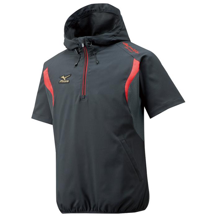 品番:12JE6J81 カラー:96:ブラック×チャイニーズレッド サイズ:S、M、L、O、XO、2XO 素材:ポリエステル100% メッシュ部:ポリエステル91%、ポリウレタン9% 詳細:・右胸にミズノランバードマークワッペン付、左肩にミズノプロ刺繍 生産国:タイ製