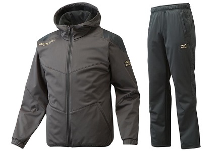 品番:ジャケット:12JE6W83/パンツ:12JF6W82 カラー:08/09:チャコールグレー×ブラック サイズ:S、M、L、O、XO、2XO 素材:ポリエステル100% 詳細:左袖にミズノランバードマークワッペン付、右肩にミズノプロ刺繍 生産国:中国製