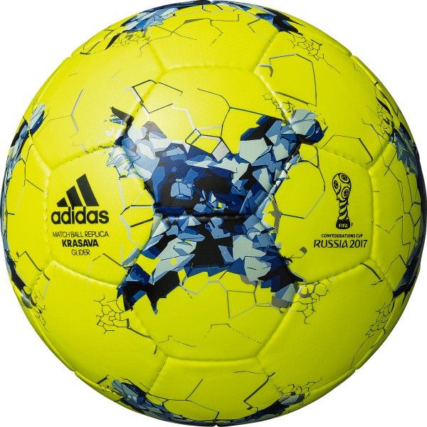 アディダス、FIFA主催大会公式試合球「KRASAVA」、レプリカ5号球。 コンフェデレーションズカップ開催国ロシアを象徴するロシアンルビーよりインスピレーションされたデザインを採用。 商品名には「とても美しいもの、それに対する究極の称賛」を意味するロシアのスポーツファンに普及している創造性に富んだプレーに対する賛辞「クラサバ」を採用。