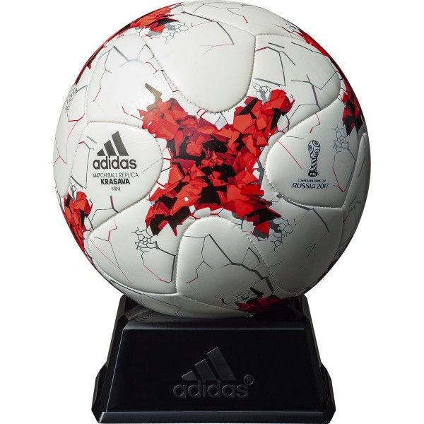 アディダス、FIFA主催大会公式試合球「KRASAVA」、レプリカミニボール。 コンフェデレーションズカップ開催国ロシアを象徴するロシアンルビーよりインスピレーションされたデザインを採用。 商品名には「とても美しいもの、それに対する究極の称賛」を意味するロシアのスポーツファンに普及している創造性に富んだプレーに対する賛辞「クラサバ」を採用。