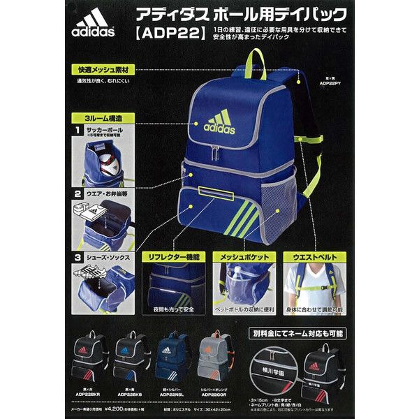 アディダス(adidas) ボール用デイパック 品番:ADP22PY カラー:紫×黄 サイズ:横30×縦42×奥行20cm 素材:ポリエステル 生産国:中国製
