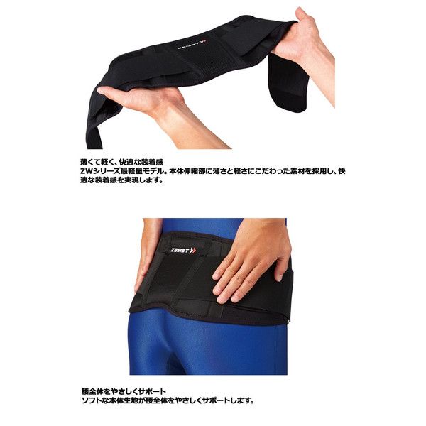 日常生活から軽スポーツに対応。 運動時、腰に少し不安のある方におすすめ! 薄さと軽さを追求したライトタイプ ZWシリーズ最軽量モデルで、腰全体をやさしくサポート。