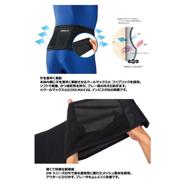 通気性重視のメッシュタイプ ZWシリーズの中で最も通気性に優れ、腰全体を快適にサポート。 本体内側に汗を素早く蒸散させるクールマックスファブリックを採用。