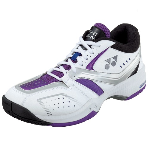 品番:SHT134W カラー:115:ホワイト×パープル サイズ:22.0cm〜29.0cm アッパー:人工皮革 ミッドソール:合成樹脂 アウトソール:ゴム底 詳細:ミッドカット、4E設計 対象コート:オムニ、クレーコート用 付属品:パープルの換え紐 原産国:ベトナム製