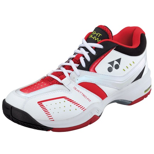 品番:SHT134W カラー:187:ブラック×レッド サイズ:22.0cm〜29.0cm アッパー:人工皮革 ミッドソール:合成樹脂 アウトソール:ゴム底 詳細:ミッドカット、4E設計 対象コート:オムニ、クレーコート用 付属品:ライムの換え紐 原産国:ベトナム製