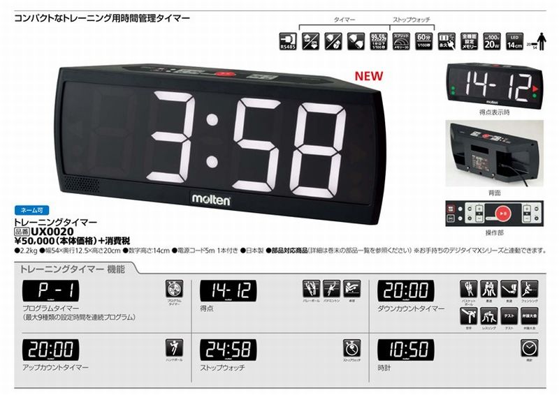 モルテン(molten) トレーニングタイマー 品番:UX0020 カラー:ブラック 重さ:2.2kg サイズ:幅54×奥行12.5×高さ20cm 付属品:電源コード5m 1本(PW05C3) 生産国:日本製