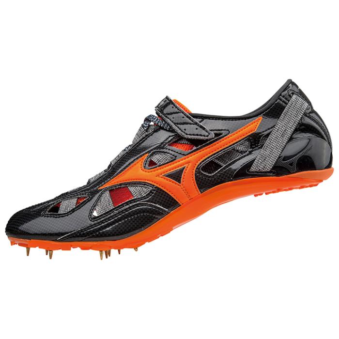 品番:U1GA1701 カラー:54:ブラック×オレンジ サイズ:22.0~29.0cm 質量:140g(26.0cm片方) 甲材:合成繊維、人工皮革 底材:合成底 スパイクピン:8ZA303(8mm)、固定式(7mm) 競技種目:100~400m、ハードル 競技場:オールウェザートラック専用 付属品:シューズ袋付 原産国:中国製