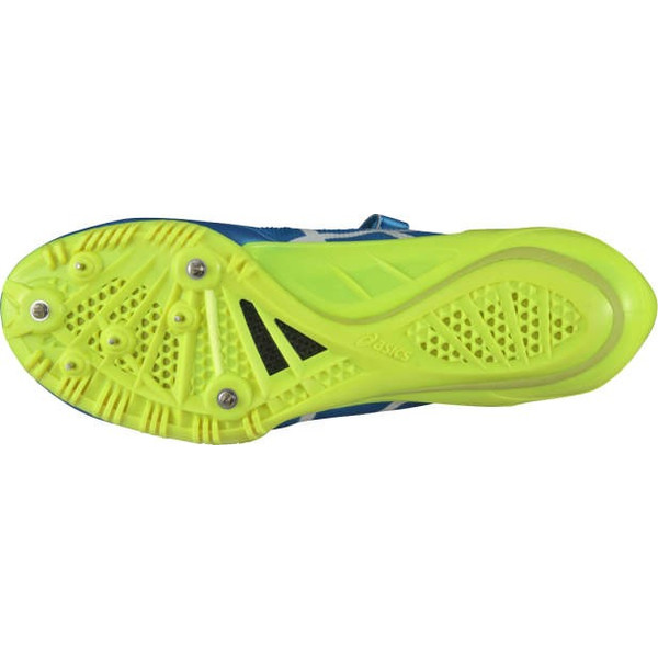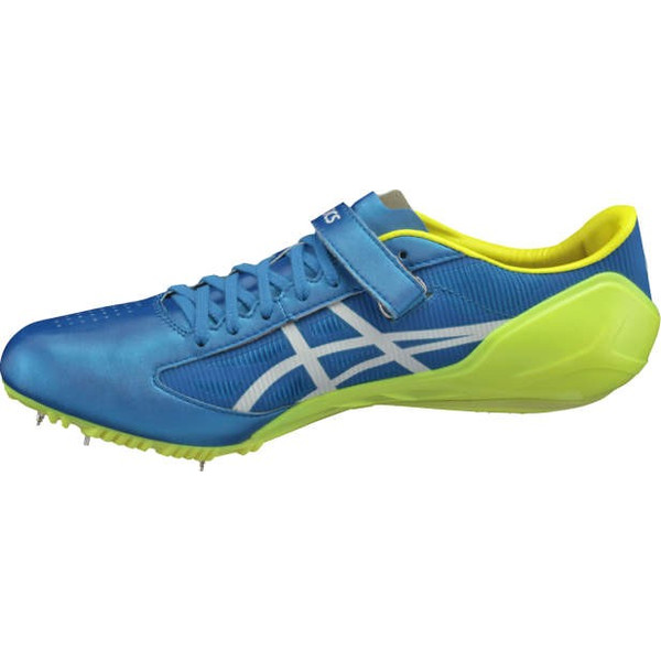 着地時や蹴り出し時のブレを抑制する、シューレースタイプのスプリントスパイク。コーナー走行時に力のかかる部分を補強する、左右非対称のアッパー構造を採用。走行時のブレを軽減し、スムーズな重心移動を促すピン配置。走行時やハードル種目の着地時に安定性を発揮する、大型樹脂ヒールカウンターを搭載。