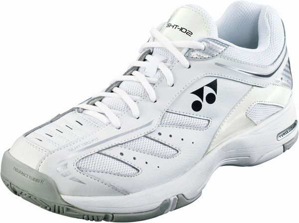 ヨネックス(YONEX) テニスシューズ パワークッション102 品番:SHT102 カラー:ホワイト(011) サイズ:22.0〜28.0cm 素材 アッパー:人工皮革 ミッドソール:合成樹脂 アウトソール:ゴム底 仕様:クレー・砂入り人工芝コート用 足幅:3E 生産国:インドネシア製