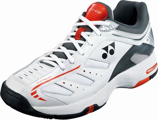 ヨネックス(YONEX) テニスシューズ パワークッション102 品番:SHT102 カラー:ホワイト×オレンジ(386) サイズ:22.0〜28.0cm 素材 アッパー:人工皮革 ミッドソール:合成樹脂 アウトソール:ゴム底 仕様:クレー・砂入り人工芝コート用 足幅:3E 生産国:インドネシア製