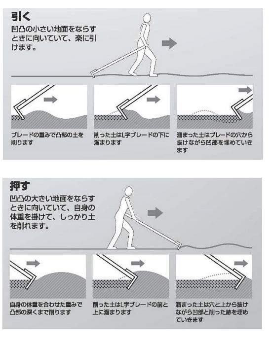 広い範囲をしっかり早くならせる新型レーキ。 サッカー・野球の土グラウンドに適しています。