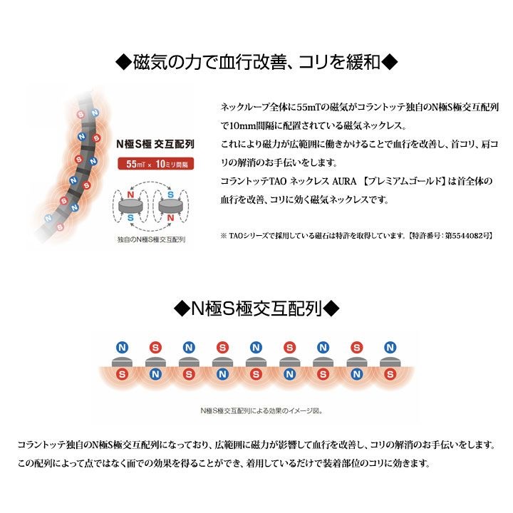 侍ジャパン 菊池涼介選手着用モデル コラントッテ(Colantotte) TAO ネックレス AURA 【プレミアムゴールド】 品番:ABAPH5 カラー:プレミアムゴールド サイズ:M(43cm)L(47cm)LL(51cm) 医療機器認証番号:221AGBZX00065000 材質:(本体)樹脂コーティング磁石(ジョイント部分)ステンレス(SUS316L/24金仕上)エポキシ樹脂POM 磁石:樹脂コーティング磁石55mTを10mm間隔でN極S極交互配列