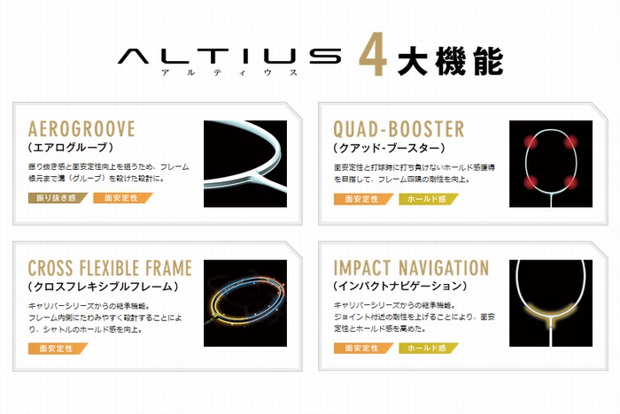 ミズノ(MIZUNO) バドミントンラケット 奥原希望選手(日本ユニシス)使用モデル ALTIUS TOUR アルティウスツアー 品番:73JTB73001 カラー:01:ホワイト サイズ:3U5・4U6 素材 高弾性カーボンフレーム+グラファイト(ソリッドカーボンコンセプト) RFカーボン HGレジン 推奨張力:23〜27(lbs) 原産国:中国製