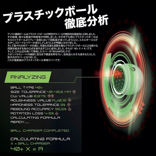 アンドロ(andro) 卓球ラバー ラザンター R47 品番:112288 カラー:赤・黒 厚さ:1.7mm、2.0mm、ULTRAMAX Speed:119 Spin:121 Control:85 スポンジ硬度:47° 性能 スポンジ:ハードスポンジ 粒の太さ:太い 粒間隔:狭い 特徴:スピン性能抜群・圧倒的パワー性能・高い弧線軌道・威力最優先 レベル:上級者〜プロ