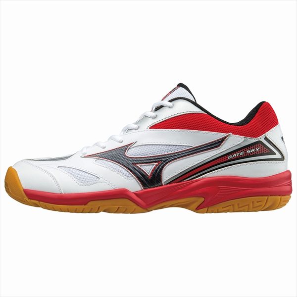ミズノ(MIZUNO) バドミントンシューズ ゲートスカイ 品番:71GA174009 カラー:09:ホワイト×ブラック×レッド サイズ:20.0、21.0、22.0〜28.5cm 素材 甲材:人工皮革・合成繊維 底材:合成底 質量:約300g(27.0cm片方)