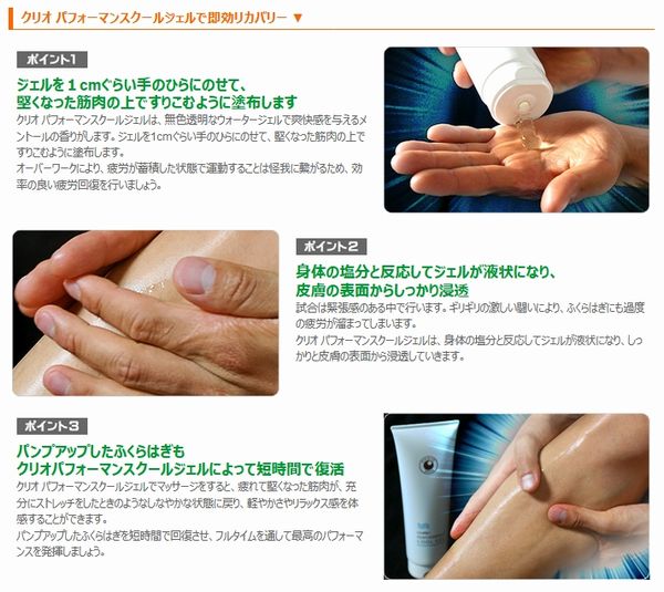 クリオ パフォーマンス ジェルは、汗をかいた身体にダイレクトに塗り込める水性ジェルです。
