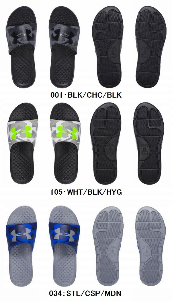 アンダーアーマー(UNDER ARMOUR) サンダル UA M STRIKE SPLICE SL 品番:1287404 カラー 001:BLK/CHC/BLK(ブラック/チャコール/ブラック) 105:WHT/BLK/HYG(ホワイト/ブラック/ハイパーグリーン) 034:STL/CSP/MDN(スティール/カスピアン/ミッドナイトネイビー) サイズ:25.0〜30.0cm 素材 甲材:人工皮革 底材:合成樹脂