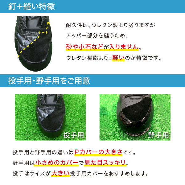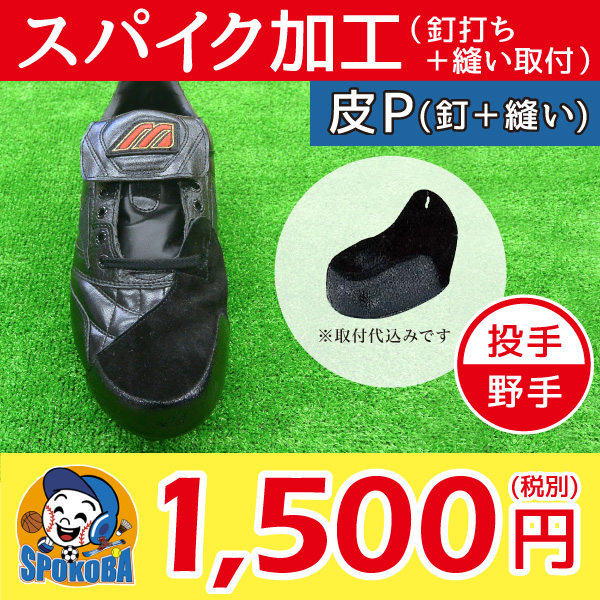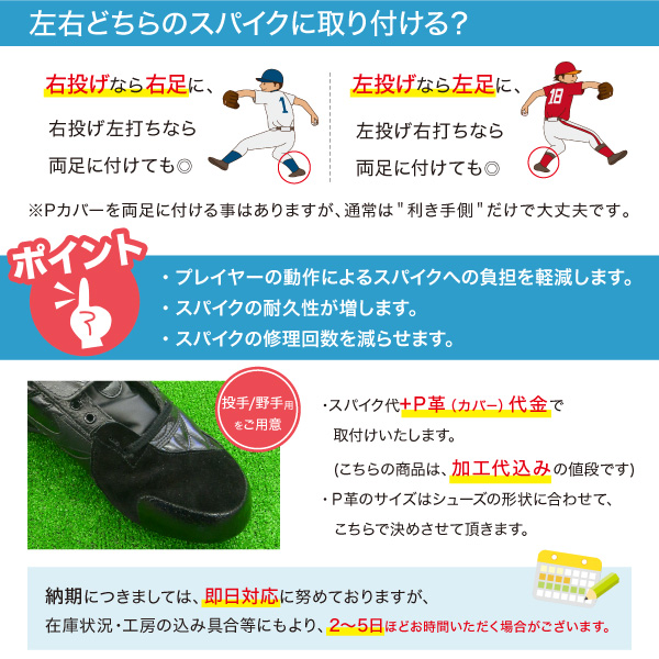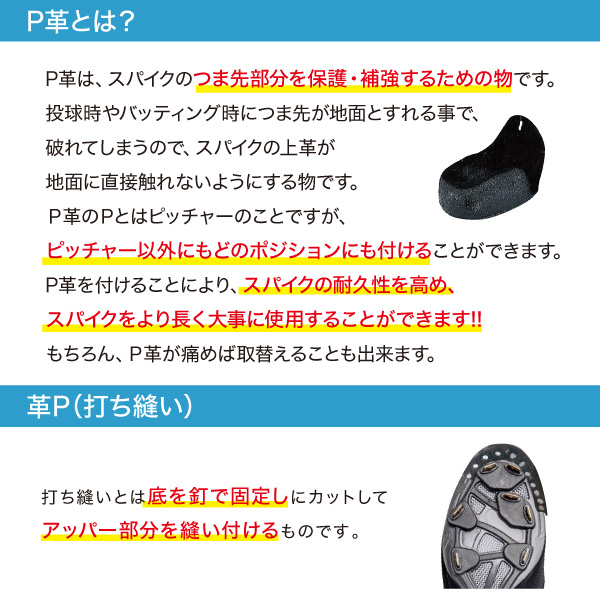 プラス1,500円(税抜)でP革を取り付けいたします。 P革は、スパイクの耐久性を高め、 スパイクを長く大事に使用することができます!! つま先が破れやすいピッチャーに限らず、全てのポジションで付けて頂くことをおすすめしております。