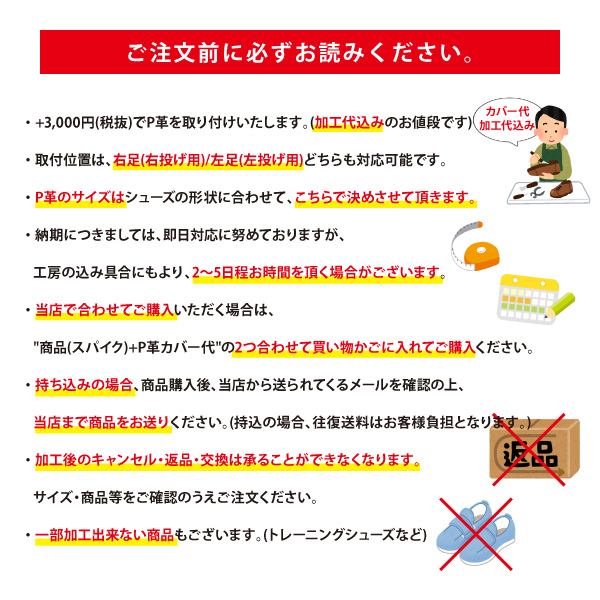 【ご注意】 ※P革はスパイクのつま先部分を保護・補強するものです。 ※P革のサイズはシューズの形状に合わせて、こちらで決めさせて頂きます。 ※納期につきましては、即日対応しておりますが、工房の込み具合にもより、2〜5日期間を頂く場合がございます。 ※カバー取付をご希望の場合、シューズと合わせてご購入頂くか、持ち込み頂くかをお選びください。 ※当店で合わせてご購入いただく場合は、”商品(スパイク)+P革”の2つを買い物かごに入れてご購入ください。 ※持ち込みをご希望のお客様は、商品購入後、当店から送られてくる確認メールをお読みの上、 当店まで商品をお送りください。(持込の場合、往復送料はお客様負担となりますので予めご了承ください。) ※加工後のキャンセル・返品・交換は承ることができなくなります。サイズをご確認の上ご注文ください。 ※一部加工出来ない商品もございます。(トレーニングシューズなど) ※商品画像のカラーにつきましては、ご利用のパソコン等の環境によって実物と多少異なる場合がありますので、あらかじめご了承ください。