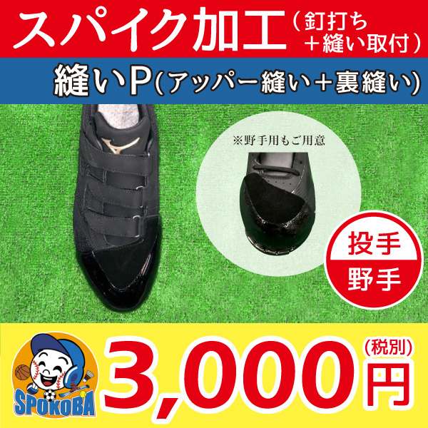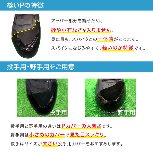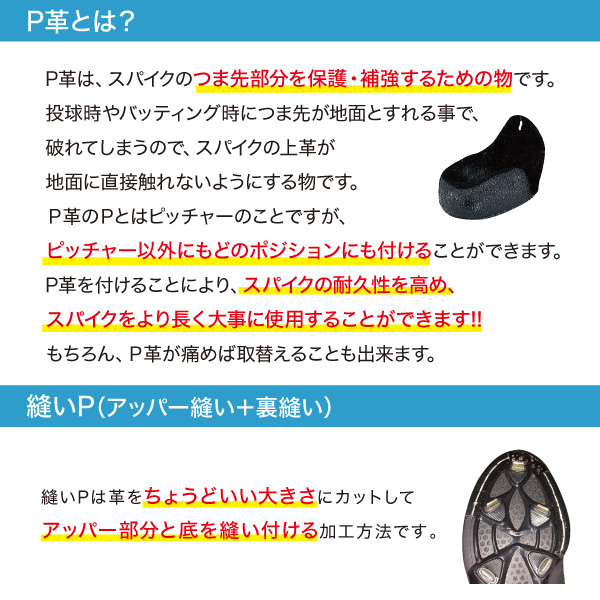 プラス3,000円(税抜)でP革を取り付けいたします。 革製Pカバーを使用しアッパー部分を特殊ミシンで縫い合わせることでスパイクとP革が一体となります。 つま先が破れやすいピッチャーに限らず、全てのポジションで付けて頂くことをおすすめしております。