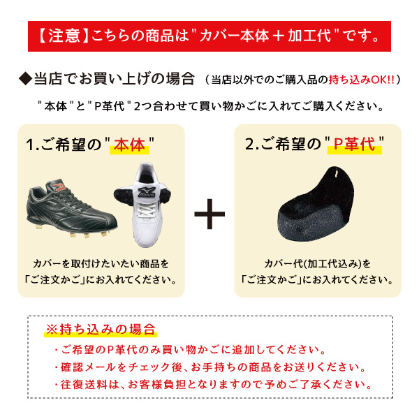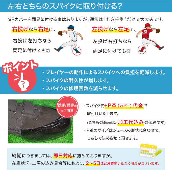 【ご注意】 ※P革はスパイクのつま先部分を保護・補強するものです。 ※P革のサイズはシューズの形状に合わせて、こちらで決めさせて頂きます。 ※納期につきましては、即日対応しておりますが、工房の込み具合にもより、2〜5日期間を頂く場合がございます。 ※カバー取付をご希望の場合、シューズと合わせてご購入頂くか、持ち込み頂くかをお選びください。 ※当店で合わせてご購入いただく場合は、”商品(スパイク)+P革”の2つを買い物かごに入れてご購入ください。 ※持ち込みをご希望のお客様は、商品購入後、当店から送られてくる確認メールをお読みの上、 当店まで商品をお送りください。(持込の場合、往復送料はお客様負担となりますので予めご了承ください。) ※加工後のキャンセル・返品・交換は承ることができなくなります。サイズをご確認の上ご注文ください。 ※一部加工出来ない商品もございます。(トレーニングシューズなど) ※商品画像のカラーにつきましては、ご利用のパソコン等の環境によって実物と多少異なる場合がありますので、あらかじめご了承ください。