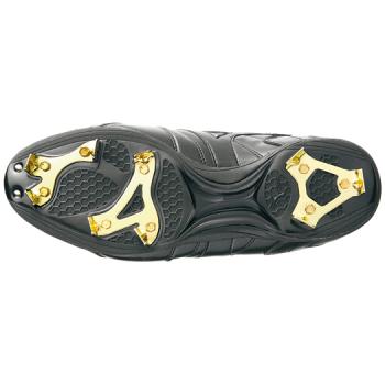 品番:2KM332 カラー:00:ブラック×ブラック サイズ:23.0〜29.0、30.0cm 本体:人工皮革 補強:人工皮革 アウトソール:合成樹脂(ナイロン) ミッドソール:合成樹脂(熱成型E.V.A.スポンジ) スパイク:金属製(新9本歯金具ボルト止め取替式) 付属品:レンチ、ボルト1個 原産国:中国製