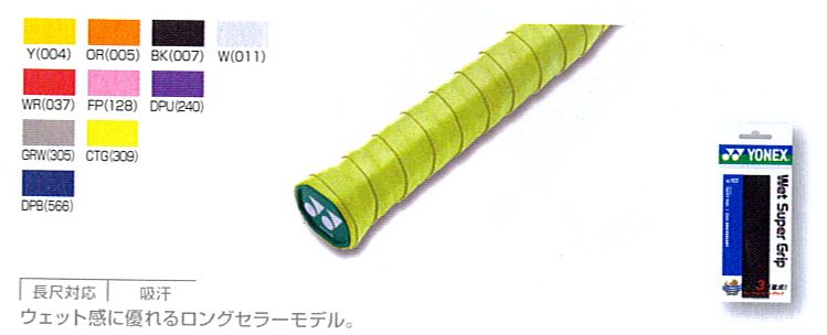 ヨネックス(YONEX) グリップテープ ウェットスーパーグリップ(1本入) 品番:AC103 カラー イエロー(004) オレンジ(005) ブラック(007) ホワイト(011) ワインレッド(037) フレンチピンク(128) ダークパープル(240) グレイッシュホワイト(305) シトラスグリーン(309) ディープブルー(566)