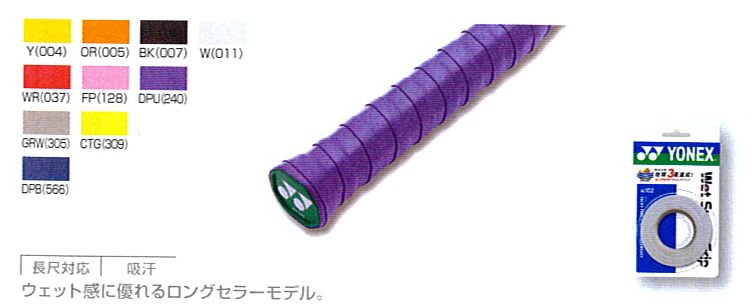 ヨネックス(YONEX) グリップテープ ウェットスーパーグリップ(3本入) 品番:AC102 カラー イエロー(004) オレンジ(005) ブラック(007) ホワイト(011) ワインレッド(037) フレンチピンク(128) ダークパープル(240) グレイッシュホワイト(305) シトラスグリーン(309) ディープブルー(566)