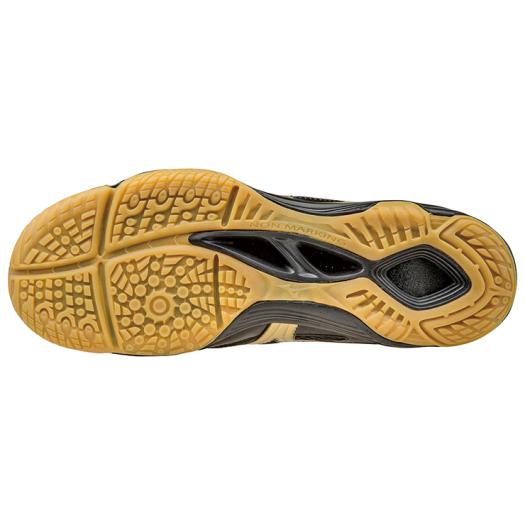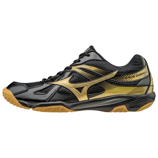 ミズノ(MIZUNO)バレーボールシューズ ウエーブオーディーン 品番:V1GA1650 カラー:50:(ブラック×ゴールド×ガンメタル) サイズ:22.5〜30.0cm 甲材:合成繊維・人工皮革 底材:合成底 質量:約250g(27.0cm片方) 機能:パラレルウエーブ、コンフォートラスト、軽量インジェクションミッドソール 原産国:ベトナム製