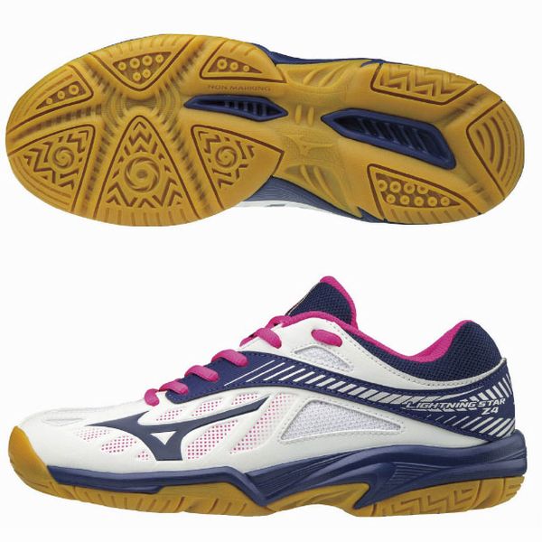 ミズノ(MIZUNO) ジュニア バレーボールシューズ ライトニングスター Z4 Jr 品番:V1GD180316 カラー :16:ホワイト×ネイビー×ピンク サイズ:19.0、20.0、21.0〜24.5cm 素材 甲材:合成繊維・人工皮革 底材:合成底 質量:約250g(24.0cm片方) ・インソール取り外し不可 ・軽量インジェクションミッドソール 原産国:ベトナム製