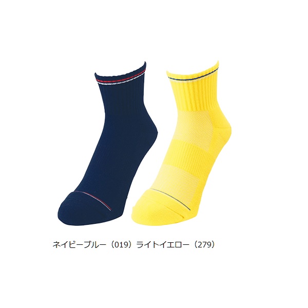 品番:29101 カラー:ネイビーブルー(019)/ライトイエロー(279) 素材:綿51%、ポリエステル23%、ナイロン2%、ポリウレタン1% サイズ:22〜25.0cm 機能:3Dエルゴ、直角型、防菌防臭、パイル 生産国:日本製
