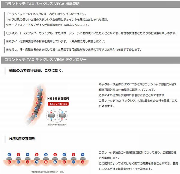 コラントッテ(Colantotte) TAO ネックレス VEGA 品番:ACTD カラー:(90)ブラック、(10)ホワイト サイズ:M(43cm)、L(47cm) 素材 ネックループ:樹脂コーティング磁石 ペンダント、ジョイント:ステンレス