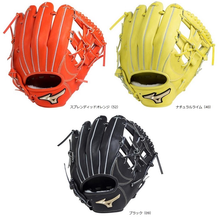 品番:1AJGH18213 カラー:スプレンディッドオレンジ(52)、ナチュラルライム(40)、ブラック(09) 素材:リンバーフィノレザー(天然皮革、牛革) サイズ:9 ポジション:内野手用 左右:右投げ用(ポケット正面タイプ) 付属品:専用袋付き 原産国:フィリピン製